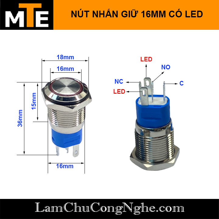 Nút nhấn 16MM giữ trạng thái ON/OFF có led chống nước Không Biểu Tượng, Đầu Bằng
